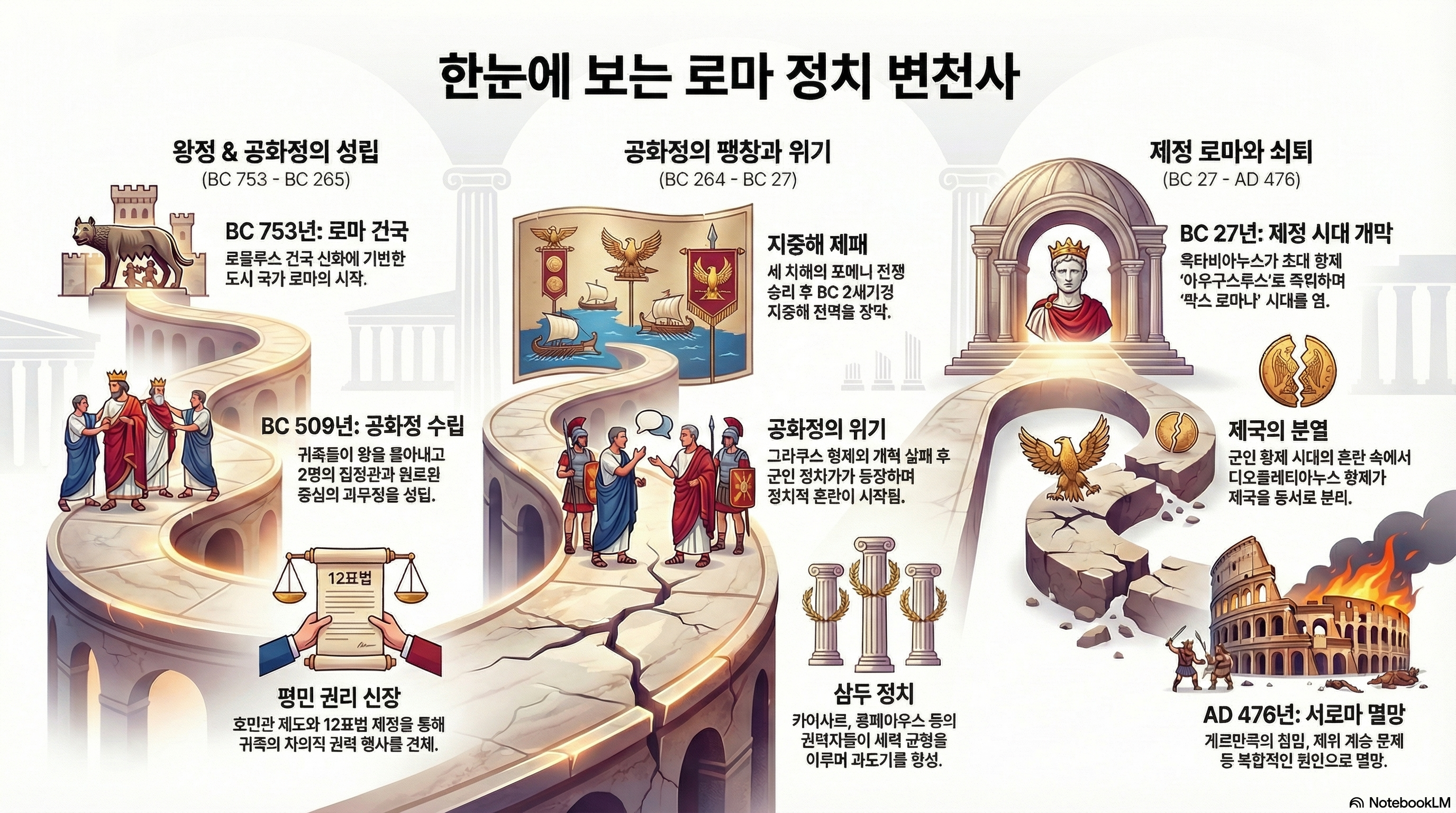 로마 제국의 정치사는 1200년이 넘는 기간 동안 왕정, 공화정, 제정이라는 세 가지 주요 정치 체제를 거쳤습니다. 이 글에서는 로마의 건국부터 서로마 제국의 멸망까지 주요 정치적 변화를 시대별로 살펴보겠습니다.
